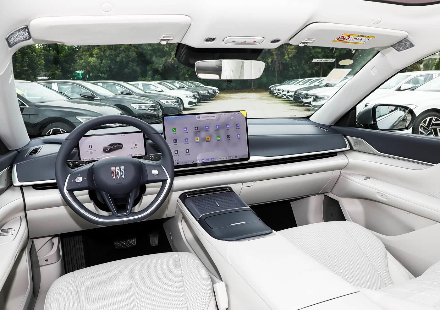 进入车内,内饰采用“浮岛”座舱设计,践行水生美学的灵动雅致,整体以环抱式布局呈现,如海浪般轻拥驾乘者,营造出舒展通透的乘坐氛围。配置方面,新车搭载10.25英寸全液晶仪表和15.6英寸中控屏,分层设计简洁高效。 50英寸AR-HUD抬头显示系统提供关键信息,减少驾驶者视线转移。车机搭载高通8775P芯片,操作流畅,配合全四座独立头枕音响,打造沉浸式影音体验。空间方面,3000mm超长轴距带来充裕的前后排空间,身高1.83米的体验者调整前排坐姿后,后排腿部仍有一臂余量,头顶空间保留一拳,虽溜背造型对后排头部有轻微影响,但整体不局促。