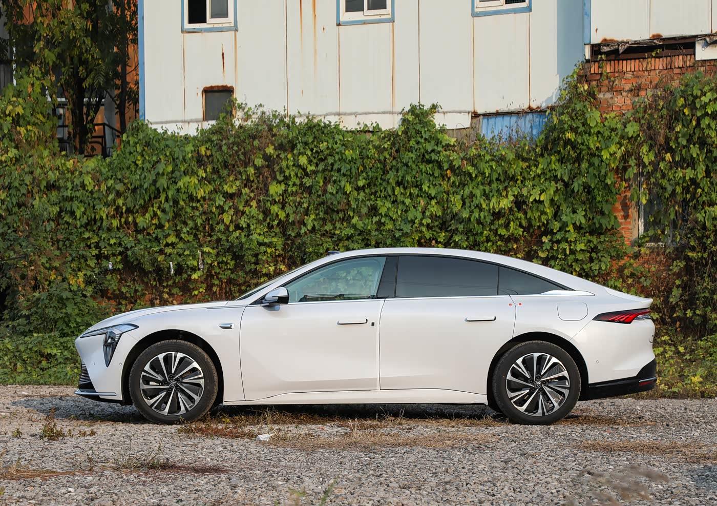 再来看车身侧面部分,身尺寸为5032mm×1952mm×1500mm,轴距达3000mm,属于典型中大型车。宽体溜背造型搭配隐藏式门把手和19英寸低风阻轮毂,运动感十足。侧面线条以“纯净浮岛”为灵感,流畅曲面与环绕氛围灯交织,营造轻盈视觉效果。 无框车门设计虽提升风噪,但双层隔音玻璃有效隔离噪音。车顶采用纯平设计,最大化内部空间,而235/50 R19轮胎规格兼顾舒适与操控。 整体比例协调,既满足商务场合的庄重感,又不失年轻群体的时尚偏好。